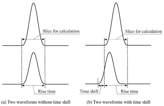 According to the theoretical analysis in Section 2.3, the best inversion accuracy can be achieved when the time shifts between correlation functions and signals are zero (as shown in Figure 9a). Although accurate source locations are helpful for extracting the slice of signals for calculation, noise contamination is inevitable. In this circumstance, the arriving and end signals are submerged in noise, and the first motions of waveforms cannot be picked precisely. Then, the time shifts between correlation functions and signals (as shown in Figure 9b) cannot be avoided, and the inversion accuracy is influenced. In this section, the influence of time shifts on inversion accuracy is analyzed. It should be noted that the time shift is different from the time delay in Equation (9). The time delay is the difference between the arrival time of the first motions and is caused by different source–sensor distances. The time shift is the picking error of the first motions and is caused by noise. The time delay does not cause inversion errors, but the time shift does.