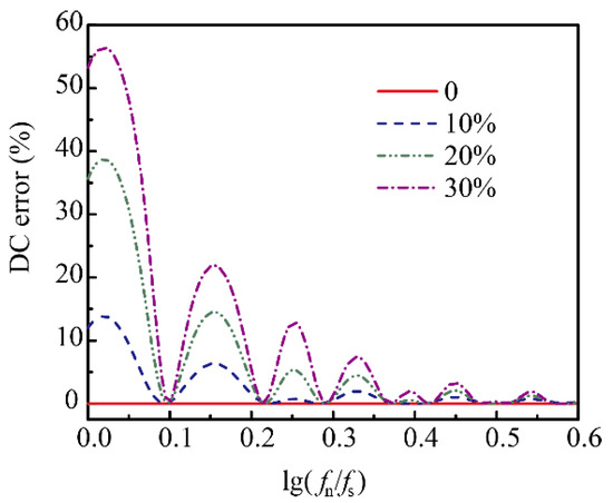 To quantify the spectrum difference, random white noise is replaced by sinusoidal noise to be added to the AE waveforms, and the frequency of noise is denoted as fn. AE signals are pulse-like functions with broad spectra, thus the dominant frequency fs (=1/Tr) is used for quantifying the spectra of AE signals. For generality, we define lg(fn/fs) to quantify the spectrum difference between signals and noise. The inversion errors of DC proportions for different lg(fn/fs) are plotted in Figure 11.
