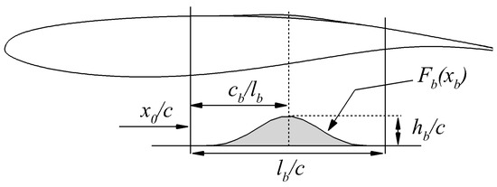 Based on previous work on shock control bumps for transonic drag reduction [38,44,45], the chosen SCB geometry is displayed in Figure 2, with its size and position relative to the OAT15A airfoil. The bump length is given as a percentage of the chord length, , the position of the bump crest relative to the bump length, , and the bump local position, , defined as the distance between the bump crest and the mean shock location, . The local position is defined by the following equation: