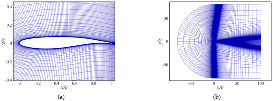 The simulations based on solving the unsteady Reynolds-averaged Navier–Stokes equations are performed to calculate the two-dimensional compressible viscous flows. The open-source code CFL3D [46] is used for the flow solution. An upwind Roe flux difference splitting method with a third-order upwind MUSCL scheme is used to resolve the inviscid fluxes. The diffusive fluxes are treated using the second-order central differencing method. According to recent research on the numerical method of shock buffet [18], the Spalart–Allmaras one equation turbulence model failed to produce shock unsteadiness on the OAT15A airfoil under the condition of , and , whereas the Stress-Omega Reynolds stress model (SORSM) overpredicted the pressure fluctuations. Menter’s k-ω SST model with a reduced coefficient was found to capture the shock unsteadiness properly. Based on our own experiences, Menter’s k-ω SST turbulence model with a coefficient of 0.286 was used for the closure of the Reynolds-averaged Navier–Stokes equations. An implicit dual-time marching scheme was applied for this study, and the time step size was chosen to be 2 μs (approximately 750 time steps per buffet cycle). Additionally, the dynamic grid method was adopted to simulate the movement of the trailing-edge flap under the closed-loop control.
