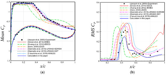 Comparison of mean and RMS pressure between the calculated results and observed in the experiments of [40] and numerical studies of [8,18,41,42,43]. Figures created by the authors using the data from the aforementioned publications. (a) Mean pressure coefficient. (b) RMS pressure coefficient.