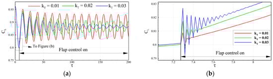 where that is hT > 0 corresponds to β < 0, which means the flap rotates upward, and vice versa; and kT is the gain to control the flap. The balanced lift coefficient was set to 0.881, which is the mean lift coefficient of the original airfoil under the buffet state of . Note that as the gain kT exceeds 0.03, the flow simulation fails to converge properly, possibly due to a large disturbance to the flow field caused by the flap deflection. Figure 5 shows the effect of gain value on the response of lift coefficient at . Figure 5b shows the variation in the lift coefficient at the beginning of flap control. It can be seen that as the gain increases, the flow disturbance caused by the flap deflection increases. As the gain exceeds the critical value (0.03), the lift coefficient changes abruptly in a very short amount of time, causing difficulties for numerical simulations. A similar conclusion is also mentioned in the study of [23]. In a further study, a gain value kT greater than 0.03 was not considered. In order to achieve an effective buffet suppression, a proper combination of control parameters, including the gain and the delay time, is needed.