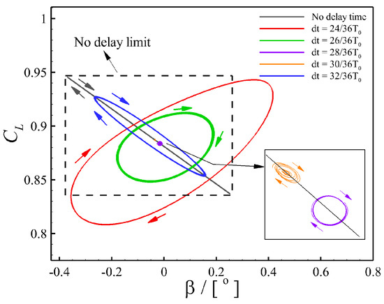 The possible combination of control parameters for an effective buffet control is explored by fixing the gain kT as 0.01 while the delay time varies. A gain value of 0.01 is considered to be a reasonable representation for practical applications. Figure 6 illustrates the phase graph of versus β, with the delay times ranging from to . Note that is the buffet period. The phase diagram for the control without delay time, which is a rectangle, is also given in the figure for comparison. At a delay time of , the phase diagram becomes a large ellipse with a clockwise rotation, indicating that the amplitude of the lift fluctuation is relatively large. As the delay time increases to , the area of the phase diagram is reduced and closer to a circle, meaning that the flap has already played a role in suppressing the amplitude of lift fluctuation. At the delay times ranging from to , the phase diagrams almost shrink to a point, indicating an effective buffet suppression. As the delay time continues to increase to , the shock buffet occurs again as the area of the phase diagram becomes large again. It can be seen that the range of delay time for an effective buffet control is only about , which is rather narrow.
