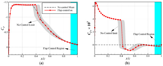 The comparison of the and distributions between the flows with and without flap control is shown in Figure 7. It shows that the steady state obtained by the flap-based control is slightly different from the mean flow state of the buffet flow. Under the closed-loop flap control, the strength of the shock wave becomes stronger than that of the original mean flow, resulting in an increase in wave drag.