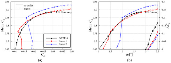 According to the previous study [44], the SCB parameters optimal for drag reduction at a given lift coefficient can be obtained, which are provided in Table 3. The comparison of the aerodynamic coefficients is shown in Figure 8. The designed bumps reduce about 11% and 19% of the total drag, respectively, at their design points compared to that of the baseline airfoil. The two designed SCBs effectively reduce the drag at their design points by turning the normal shock wave on the baseline airfoil into a λ-type shock wave, therefore weakening the shock strength and reducing the wave drag. The same conclusion has been drawn in [32,35]. In comparison with the D2 condition, the wave drag reduction under the D1 condition is lower due to a weaker shock intensity. In addition to drag reduction, both bumps slightly delay the buffet onset, resulting in increased maximum lift coefficients of 2.5% and 5.6% higher than that of the baseline airfoil, respectively. Additionally, both bumps damp lift oscillations inside the buffet regime, as shown in Figure 8b.