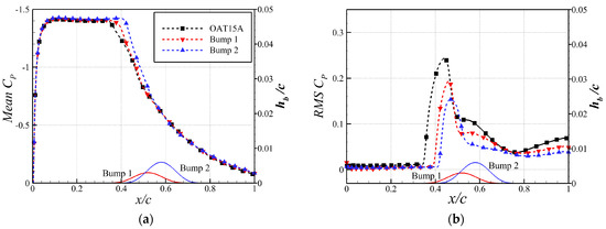 The mean pressure distributions and the RMS of pressure fluctuations of different configurations are illustrated in Figure 10. It shows that the increase in mean lift is mainly due to postponing the mean shock location of the bumps. Additionally, the pressure fluctuations near the mean shock location and the trailing edge are both reduced, while the bumps postpone the beginning point of the pressure fluctuation downstream. Geoghegan et al. [38] investigated the influence of passive SCB parameters on shock buffet control and found that both the position and height of SCB have a significant impact on buffet control. At the same time, they noted that the bumps, within 5% of the chord length of the mean shock position at the buffet condition, suppressed the shock oscillation earlier than the bumps positioned downstream. This explains that in this paper, Bump 1, located further upstream, can accomplish the same level of buffet alleviation with a lower height than Bump 2 (located further downstream).
