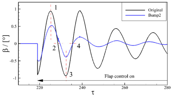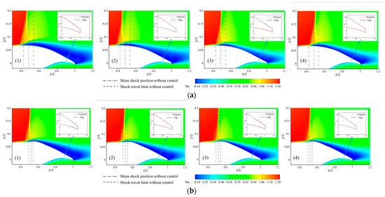Figure 12 and Figure 13 show the dynamic process in one period of flap control. The figures illustrate the trailing-edge flap deflections and the Mach number contours at different moments. In Figure 13a, it can be seen that the shock wave goes from downstream to upstream from time (1) to time (2), and the flap deflects downward, restricting the shock wave’s upstream moving trend. At time (2), it is clear that the upstream range of the shock movement becomes smaller due to the downward flap deflection as compared to that without flap control. From time (2) to time (3), the shock wave begins to move downstream from upstream, while the trailing edge begins to deflect upward, limiting the downstream trend of the shock movement. The shock wave moves to the farthest downstream location at time (4), and the buffet range is significantly reduced compared to that without flap control. After repeating the above process, the motion of the shock wave is eventually stabilized around the mean location, achieving the buffet suppression. A similar dynamic process can be found in Figure 13b as well, except that the flap deflection angle is reduced due to a shorter range of the shock movement restricted by the presence of the bump.