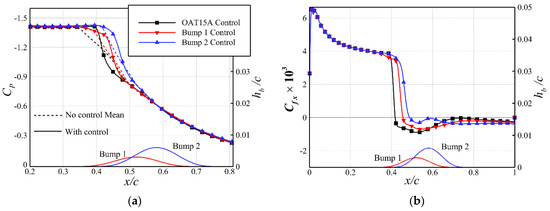 Figure 14 shows the pressure and skin friction distributions at the steady state under the closed-loop control for all three configurations. It can be clearly seen that the bumps with control push the shock downstream and weaken the shock strength, resulting in an increase in lift and a decrease in pressure drag at the cost of a small increase in skin friction drag, as shown in Figure 14b. Using the skin friction in the streamwise direction as an indication of boundary layer separation, it can be concluded that the bumps postpone the flow separation region downstream, thus weakening the shock-induced flow separation around the foot of the shock wave. Figure 14b presents the distributions for different configurations. For the Bump 2 configuration, some variation in the skin friction coefficient can be observed around the bump crest position. The reason is that the presence of the bump causes the separated boundary layer in the upstream to reattach at the front of the bump, and then the boundary layer separates again at the bump tail due to a high local curvature.