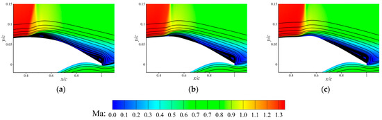 The Mach number contours for the steady states are shown with streamlines in Figure 15. Two flow separation bubbles can be observed on the upper surface of the original airfoil. The upstream one is apparently induced by the shock wave, while the downstream one is due to the trailing-edge separation. The bumps have effectively reduced the size of the upstream bubble due to their ability to weaken shock strength. However, due to a higher local curvature caused by the bump, the downstream flow tends to be more easily separated, resulting in an enlarged separation bubble downstream. Although the downstream bubble is enlarged by the bumps, it can be seen that this negative effect is surpassed by the positive effect of reducing the shock strength. Overall, it can be concluded that the passive shock control bumps designed for drag reduction can coexist with the active flap-buffet control system and can even improve their performances in buffet control.