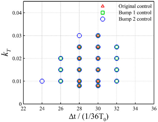 As previously mentioned, a proper combination of the delay time and the gain kT is required for an effective closed-loop flap control. Therefore, different combinations of these two control parameters are investigated. Figure 16 shows the combinations of control parameters that can completely suppress the transonic buffet under the condition of , , and . It is clear that the range of the delay time for an effective buffet control is very narrow on the original airfoil, whereas Bump 1 almost doubles the effective range, and Bump 2 can further improve from that of Bump 1. Note that the control system with a wider range of effective control parameters can tolerate a higher level of fluctuations in the operating environment, thus offering more robustness. In summary, the SCBs designed for drag reduction have a positive effect on improving the robustness of the closed-loop flap control.