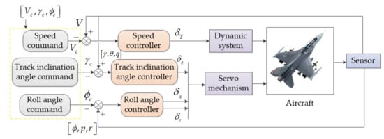 The UAV flight control system was built as shown in Figure 2. The speed controller shown in the figure controls the flight speed of the UAV by utilizing the power system; the track inclination angle controller and roll angle controller control the track inclination angle, roll attitude, and yaw stability of the UAV via the servo mechanism. In terms of altitude, controlling the track inclination angle command of the track enables it to climb, level flight, and dive; laterally, it can carry out left roll, level flight, and right roll maneuvers by controlling the roll angle command. In terms of speed, speed command is used to control its acceleration, deceleration, and smooth flight.