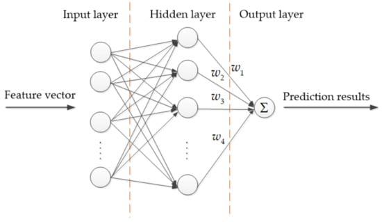 RBF neural network is a three-layer feedforward neural network, which can be divided into an input layer, a hidden layer, and an output layer []. First, calculate the Euclidean distance between the input feature vector and the sample vector in the hidden layer, then calculate the value of the Euclidean distance radial basis, and finally linearly weigh the output value of the hidden layer to obtain the final output value, as shown in Figure 4.