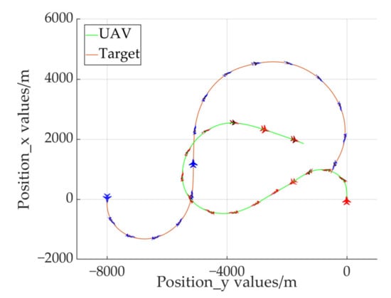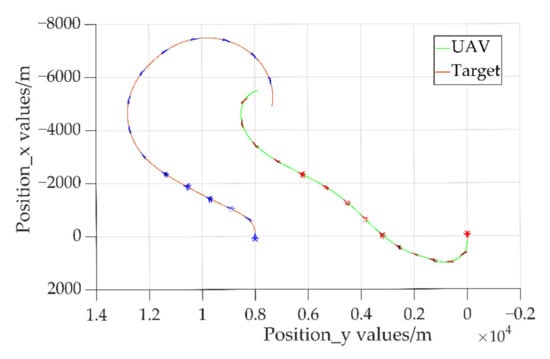 The initial position of the target is shown in Table 4. The air combat three-dimensional trajectory and plane trajectory of the two aircraft in case 1 are shown in Figure 7 and Figure 8.