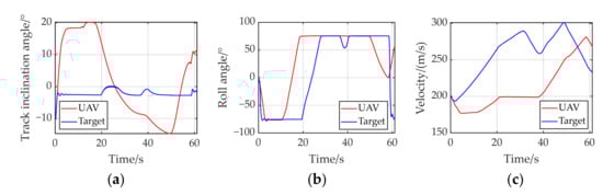 Figure 9 shows the change in the track inclination angle, roll angle, and speed of the enemy and our aircraft with time in the air combat. The air combat trajectory shows that our aircraft initially rolls to the right and climbs at the cost of speed. In the beginning, it reaches the position of comparative advantage, and then it maintains this advantage until the missile locks the target and determines to hit.