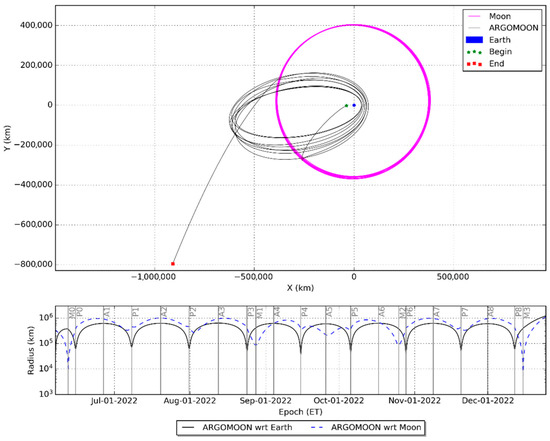 The ArgoMoon’s reference trajectory is designed by Argotec with the aim of flying the S/C between the cis-lunar and the translunar space for 180 days. The shift of the SLS launch dates had only a negligible impact on the trajectory geometry as well as on the operations timeline. The analysis discussed in this paper, based on the launch window of 6 June 2022, can be considered for past and future launch dates. The reference trajectory has been designed as a highly elliptical geocentric orbit characterized by two close fly-bys of the Moon, one at the beginning of the mission and the other at the end. The first fly-by (M0) occurs approximately five days after the deployment, and it is used by ArgoMoon to shape its orbit around the Earth. The other fly-by of the Moon (M3) is designed to inject the S/C into a heliocentric orbit for its disposal at EOM. In between, there are also two secondary fly-bys of the Moon (M1 and M2), with a Closest Approach (C/A) at a very high altitude (above 80,000 km), which makes them not critical for the mission. The trajectory is displayed in Figure 2, and the fundamental mission events are summarized in Table 1.