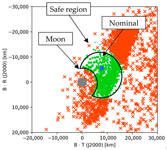 Figure 3. B-Plane [16] admissible region for the last fly-by of the Moon (M3). - DSN pointing uncertainty: to ensure the link with the DSN 34 m antennas, the pointing uncertainty due to S/C orbit determination shall be lower than 0.031 deg, which corresponds to the Half Power Beamwidth (HPB) of the antenna at X-band [15]. However, during the first day of the mission, the threshold value of the pointing uncertainty is relaxed to 1.05 deg, which corresponds to half of the HPB of the 34 m dishes equipped with the 1.2 m aided acquisition antenna above the sub-reflector [15].