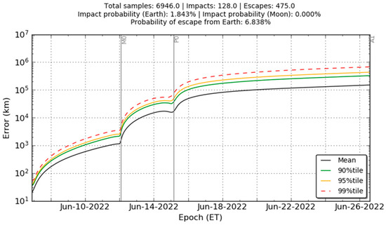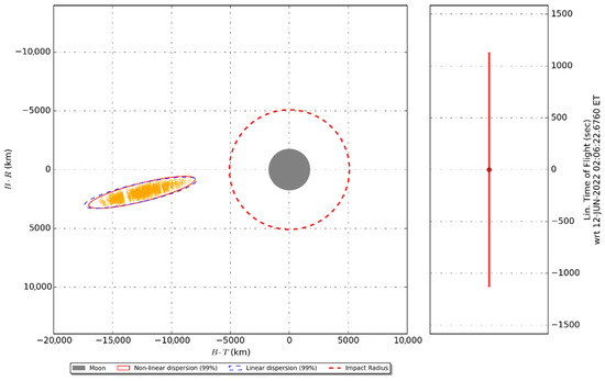 The assessment of the navigation feasibility requires evaluating the amount of propellant needed to correct the errors that may potentially affect the trajectory. An optimal trajectory control strategy is then required to correct the statistical errors without exceeding the ΔV allocated to the navigation. The FPC analysis of this paper was performed to design a control strategy that significantly reduces the dispersion with respect to the reference trajectory while minimizing the number of maneuvers and the total required ΔV. The study was conducted using a linear analysis to test different maneuver schedules, aimpoints, and target coordinates [26]. Then, once an optimal solution was found, a non-linear analysis was carried out to validate the trajectory dispersion and the statistical ΔV. The linear method uses the covariance mapped to future times to evaluate the dispersion and the controllability of the selected targets. The non-linear approach is based on the numerical propagation of the trajectory using the same high-fidelity model described in Section 4.2. Both simulations were performed using the Monte Carlo method, which samples from the covariances designed to describe the expected sources of errors. The considered sources of error and the relative assumptions are summarized in Table 2. The wide uncertainty on the SLS performance and ArgoMoon propulsion system capabilities are expected to be the predominant sources of error.