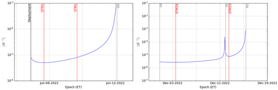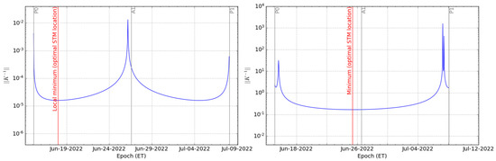 The K-inverse norm evolution for the fly-bys M0 and M3 are shown in Figure 6. Before M0, the minimum of the norm is located approximately where the OTM1 has been placed by the mission analysis team. Then, moving toward M0, the norm becomes larger, causing any maneuvers close to the fly-by to be more expensive in terms of ΔV. For this reason, STM1 was placed 48 h after OTM1, as early as possible, but still keeping a sufficient margin to perform the navigation process. The norm analysis of M3 was performed starting from the beginning of the REV8. The results highlight two local minima of the norm, approximately one at two days after the apogee A8 and the other 12 h after the last perigee P8, where the correction maneuvers STM18 and STM19 should be placed.