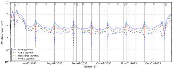 Finally, using the found optimal locations and targets for the STMs, a Monte Carlo non-linear analysis has been performed to assess the expected statistical ΔV and the controlled trajectory dispersion. The statistical ΔV is reported in Table 4 in terms of mean, i.e., the expected value, and the 99th percentile, used for the requirements validation. The ΔV results show that STM1, STM2, STM3, and STM4 are the most expensive statistical maneuvers. Observing the controlled dispersion in Figure 8, the peaks on the position errors with respect to the reference trajectory occur during REV0, especially after M0, reaching a maximum value at P0 of about 3000 km. After A1 and before M3, the dispersion always remains below about 400 km (at perigees), increasing again to 1000 km only at EOM because of the disposal flyby M3.