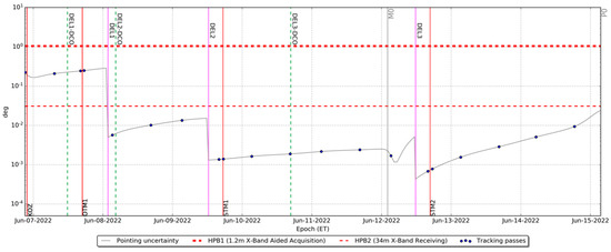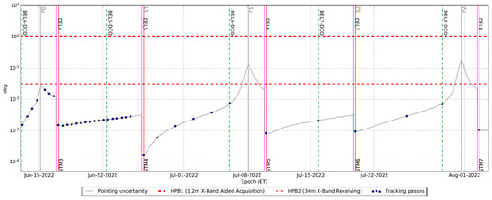 The pointing uncertainty through the whole mission exhibits a series of peaks around the perigees that exceed the pointing requirement. This behavior is caused by the rapid decrease of the S/C distance with respect to the Earth during the closest approaches. However, no tracking passes are placed at the perigees and by considering the uncertainty only at the epochs of the tracking passes (the blue dots in Figure 10 and Figure 11), the pointing requirement is always satisfied, at a 3-sigma level.