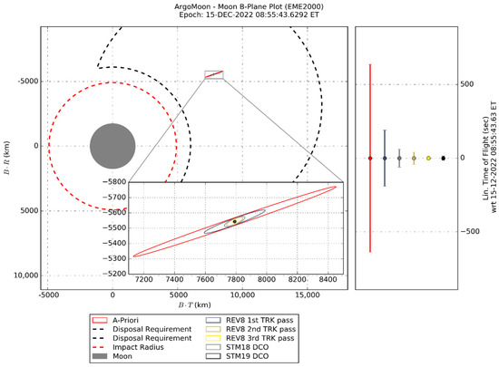The robustness of the navigation performance has been assessed through a parametric variation of the navigation setup described in Section 3.2 and Section 4.4, such as a priori uncertainties and measurement acquisition schedule. This sensitivity analysis of the OD and FPC allowed identifying the critical parameters that influence the navigation results, in terms of DSN pointing and disposal requirements (OD) and ΔV cost and trajectory dispersion (FPC). As a result, it has been shown that the dispersion and OD uncertainty at the fly-by M3 are always widely contained in the requirement region (Figure 3) for each of the tested cases, implying that the disposal requirement is not affected by the variation of the parameters. Moreover, even if the trajectory dispersion increases up to a factor of ten in some of the tested sensitivity cases, the impact’s risk requirement is always satisfied.
