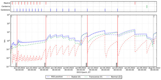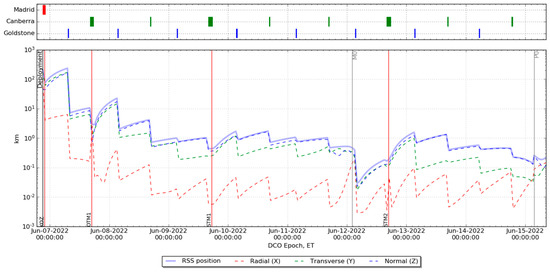 The OD is designed as a batch-sequential single-arc estimation where each arc encompasses a trajectory’s REV. The S/C state a priori covariance at the beginning of the first arc (REV0) is assumed to be equal to the ICPS covariance at the BS1 epoch. The dynamics of the unmodeled proximity flight during the first 30 min of the mission are neglected since it does not significantly increase the state covariance. For REV1 to REV9, the S/C state a priori covariance is obtained by mapping the S/C state estimated covariance of the previous arc, scaled by a safety factor of 4. The stochastic accelerations are simulated to account for the mis-modeling of small forces and assess their effects on the expected uncertainties. The measurement of the quality of the estimation will be carried on during the operations by monitoring the estimated stochastic accelerations. The DCO of an orbital maneuver identifies the epoch after which no more data is considered to compute the maneuver. The time between the DCO and the correspondent maneuver shall be sufficient to acquire the necessary data, generate the OD solution, compute the maneuver using the FPC, validate the navigation outputs, generate the S/C commands, and upload them through the DSN antennas, including the necessary margins. Nominally, the DCO of the STMs is set to four days prior to the maneuvers. However, the DCO of STM1 is only 32 h before the maneuver, because it cannot be placed further away from the deployment, and so closer to the Moon flyby, due to ΔV cost reasons. Moreover, since ArgoMoon cannot activate the transponder during the execution of an orbital maneuver, no tracking data are simulated from five minutes before the maneuver to five minutes after. The introduced baseline assumptions for the OD process are summarized in Table 5.