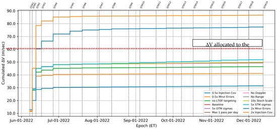 The results of the total statistical ΔV are reported for each relevant case in Table 8. As expected, the injection covariance and the maneuvers execution error are the predominant parameters that drive the total statistical ΔV. In fact, as can be seen in Table 4 and Figure 16, most of the ΔV cost is concentrated in the first four STMs, that are required to absorb the dispersion due to the injection uncertainty (as introduced in Section 3.2).