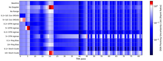 Full mission DSN pointing requirement ratio between the expected uncertainty and the requirement, for each tracking (TRK) pass, with respect to each relevant sensitivity case.