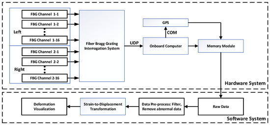 The software system was designed to transform the preprocessed sensing data into the structural deformation and display the final results. In general, the raw data are not directly used because of high-frequency noise and abnormal data. Therefore, the raw data need to be filtered, and the abnormal data need to be removed. After that, the desired structural deformations can be reconstructed by the STD transformation. Finally, the displacement response of arbitrary point on the structure or the whole structure configuration can be plotted by the visualization module.