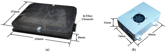 The overall scheme of the FOSS, including the hardware system and software system, is shown in Figure 2. The hardware system is divided into two independent systems for collecting and storing sensor data of the left and right wings. Each of the system consists of a FBG interrogation module, an onboard computer, a GPS and a memory module. The requirement of such an interrogation module would depend on the strain measurement along the front and aft wings of the 60-m wingspan. Figure 3a shows the interrogation system, the main parameters of which include an overall size of 234 mm × 172 mm × 28 mm, a sampling rate of 1000 Hz, 16 fiber channels, 1.04 kg weight and Ethernet interface. The environmental requirements were to meet a maximum wavelength shift of 5 pm under −10 °C to 50 °C operating temperature range, and a sine wave vibration in a range of 10–150 Hz with overload of 2 g. The characteristic wavelengths obtained by the interrogation system are transmitted to the onboard computer through UDP protocol. Meanwhile, the time series from GPS along with the fiber sensor data will be reorganized and stored in the memory module. The time consistency of test data from difference devices is guaranteed by the time series provided by GPS. Figure 3b shows the onboard computer, which has a 1.5 GHz 4-core CPU, a maximum RAM of 8 GB and multi-type interfaces including USB, HDMI, LAN, etc. The operating system is based on LINUX. A 64 GB Micro SD Card is used to store the sensor data. The onboard computer and a cooling fan are enclosed in an aluminum box with a size of 89 mm × 74 mm × 31 mm. The total weight is approximately 0.156 kg. Additionally, the main parameters of the used FBG sensor are listed in Table 1.