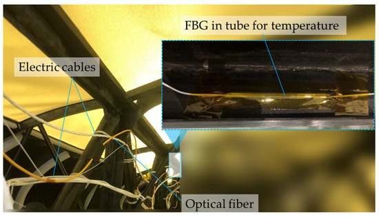Figure 5 is a snapshot of the wing interior. Both the electric cables and the optical fibers are bundled with the skeleton inside the wing. The FBG sensors are attached to the spar surfaces using epoxy adhesive. The temperature compensation is realized by the FBG sensor in a tube with a rigid steel needle inside.
