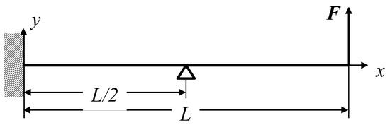 A cantilever beam supported at the midpoint was first investigated to demonstrate the improved modal method. The beam has a rectangular cross-section with a width of 0.035 m and a height of 0.0015 m. The elastic modulus is 210 GPa. The material density is 7750 kg/m3. As shown in Figure 6, a concentrated force is applied at the beam tip, with its vertical components being 0.1 N. The beam is solved in MSC NASTRAN with the discretization of 50 elements.