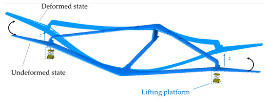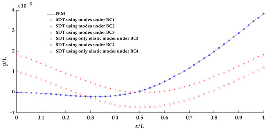 Then, the displacement can be obtained by Equation (4). Using the above equations, we do not need to calculate the modes corresponding to each boundary condition. Instead, only the free–free modes are used to determine structural deformation under arbitrary essential boundary conditions.