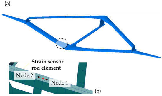 The FE model was constructed from the original CAD model in MSC NASTRAN, as shown in Figure 8a. Most of the structures including the wing spars and skin were modeled using composite plate elements. The fuselage skeleton uses a large number of bar elements. The FE model has approximately 370,000 nodes and 340,000 elements. A number of 64 massless rod elements with negligible stiffness were attached to the spar surface of both right and left wing, respectively. These elements do not change the stiffness and inertial properties of the original aircraft model. They are distributed at the positions in accordance with the sensor layout in Figure 4, serving as virtual strain sensors to provide strain information at these locations. Figure 8b shows a schematic view of a rod element.