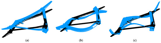 Modal analysis was then conducted to obtain mode frequencies and mode shapes of both displacement modes and strain modes. The strain modes are provided by the virtual strain sensor elements. The boundary condition is set to free–free without constraints. The first 30 modes are used for SDT. The first six modes are rigid-body modes. Several primary elastic mode shapes are plotted in Figure 9. The first symmetric vertical bending mode has a very low frequency of 0.354 Hz. Different from the common-configuration aircraft, a distinctive modal feature of the joined-wing configuration is the coupling of the front wing and the aft wing, which can be found in Figure 9b,c.