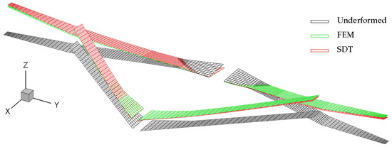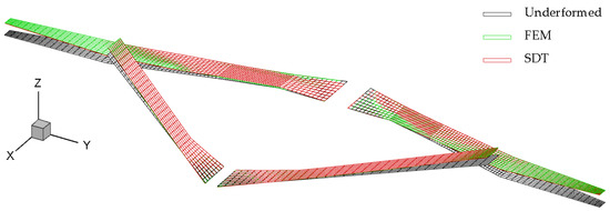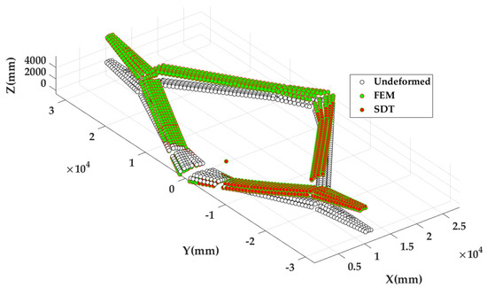 In the linear static solver of MSC NASTRAN, the six degrees of freedom (DOFs) of the grid point coincident with the mass center are constrained. One times gravity loads along the anti-gravity direction are applied to make the wing bend upward. The free–free modes were used for SDT. Figure 10 shows the comparison of an undeformed and deformed configuration under such loading conditions. The displacements calculated directly by FEM are in very good agreement with those reconstructed by SDT. The maximum displacement in z-axis direction is up to 4.71 m, which is approximately 14.1% of the half wingspan. Due to the complexity of the FE model with up to two million DOFs, it is too time-consuming to reconstruct the deformation using the modal information of all nodes. Here, we select 1188 grid points on the wing structure for SDT. Three rotational DOFs in the displacement modal vector are ignored. In this way, the matrix of displacement mode in Equation (4) has 3564 rows and 30 columns. The matrix of strain mode in Equation (5) has 196 rows and 30 columns. Although only the deformation of the selected grid points is shown here, the position of any other point inside the whole aircraft can be conveniently calculated by surface spline interpolation [29]. Figure 11 presents the interpolated lifting surface, which is used to conveniently and efficiently evaluate the overall deformation of the aircraft.