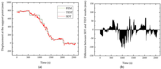 (a) Displacement responses at the support point; (b) difference between SDT and TEST results.