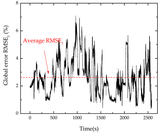 Figure 15 shows the deformed configuration obtained from FEM and SDT at the beginning of the test. The overall deformation obtained by direct numerical simulation is in good agreement with that reconstructed by measured strains. Taking FEM results as reference, the global error RMSE1 at each moment was calculated and plotted in Figure 16. The maximum error is approximately 7%. The average error is 2.62%. The results show that the FOSS and SDT algorithm in this work can accurately measure the deformation of the Joined-Wing aircraft during the ground test.