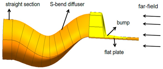 The model of the S-duct intake is shown in Figure 1 and the dimensions of inlet and outlet are shown in Table 1. In order to improve electromagnetic performance, the section of the diffuser changes from the semi-elliptic inlet to the circular outlet through the S-duct diffuser. To simulate the fuselage boundary layer, a flat plate with the length of 2 m and thickness of 0.01 m was placed in front of the inlet. Besides, the maximum cross-sectional area of the bump is 10% of the inlet to exclude fuselage boundary layer.
