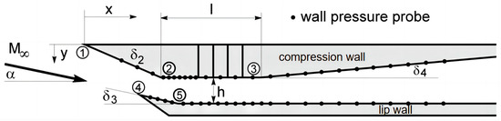 - Herrmann, C.D.; Koschel, W.W. Experimental investigation of the internal compression of a hyper-sonic intake. In Proceedings of the 38th AIAA/ASME/SAE/ASEE Joint Propulsion Conference & Exhibit, Indianapolis, IN, USA, 7–10 July 2002. AIAA-2002-4103. [Google Scholar]