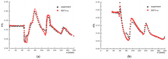 The mesh near the wall were compressed to meet the requirements of the standard wall function. Figure 3 shows a comparison of the experiment and calculation results by the ratio of static pressure to total pressure on compression (a) and lip (b) walls. The calculation results are highly consistent with the experimental results. Therefore, the SST k-ω turbulence model was applied to a numerical simulation of the aerodynamic performance of the S-duct intake.
