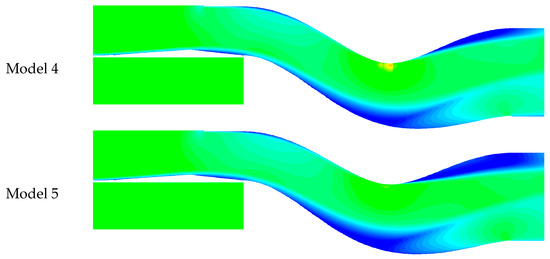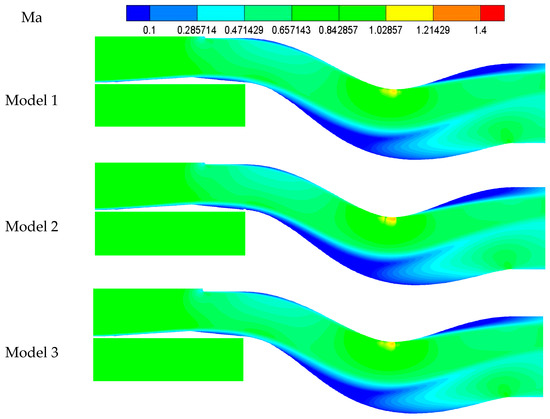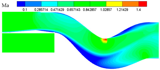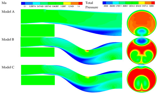 The distribution of the Mach number at the symmetrical section calculated by using mesh-B is shown in Figure 6 and the total pressure distributions of the outlet calculated by using the three types of mesh are shown in Figure 7. Due to the large adverse pressure gradient in diffuser, two backflow zones appeared, reducing the actual flow area, and increasing the TPD index of the outlet. Besides, due to the large curvature of wall and the high subsonic mainstream, a local shock wave was formed at the upper wall of the S-bend section, reducing the total pressure recovery (TPR) coefficient. According to Figure 7, the difference of flow field distribution between mesh-A and mesh-B was more significant than that between mesh-B and mesh-C, especially at the boundary between the low- pressure and high-pressure zones below the outlet. The results of total pressure at outlet were summarized in Table 5. Therefore, the number of mesh used to calculate was set to 2 million such as mesh-B.