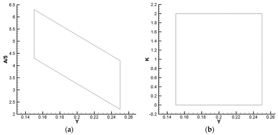 In order to reduce the intensity of the local shock wave and effectively block the outlet, two constraints were determined during parametric modeling: ① the minimum Y-axis coordinate value of the connection between the upper wall vertices should be less than 0; ② the shortest distance between upper wall vertices of fifth and sixth sections should be greater than 50 mm. After testing, the two constraints mainly affect the independence of Y and A, as shown in Figure 11a. Therefore, a correction factor K is introduced to fix irrelevance between the parameters by replacing A, as shown in Figure 11b. The variation range of each parameter was determined according to design experience and quartic function characteristics, as shown in Table 7.