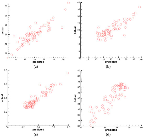 To improve optimization efficiency, four Kringing models between the performance variables and the model variables were established as the efficient models, based on initial sample data. The predicted values of the four efficient models and the actual values of the four performance parameters are shown in Figure 12. Obviously, only a few points have a large error, including five points in Figure 12a, two points in Figure 12b, and one point in Figure 12c. Therefore, the four effective models basically have high reliabilities in the sample space, which can effectively accelerate the optimization design.