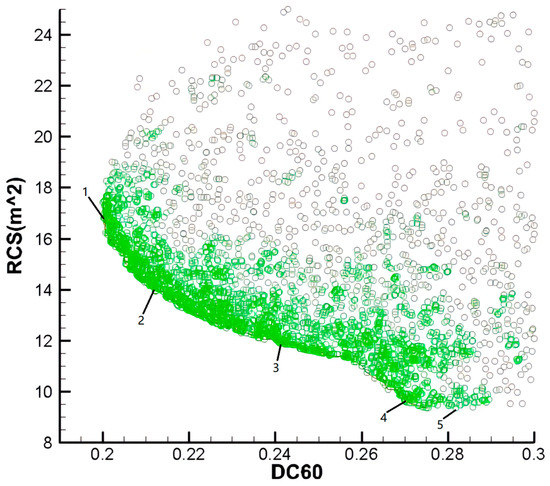 Five sample points marked in Figure 13 were randomly selected from the Pareto front to verify the reliability of the front. Figure 14 shows the Mach number distributions. The RCS values are shown in Figure 15. The backflow zone of each intake was significantly smaller than that of the original intake and the shock wave intensity was remarkably reduced. Besides, five intakes have smaller RCS values than the original intake.