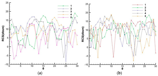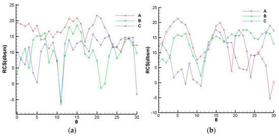 The RCS calculation results of model S are shown in Figure 9. Table 6 shows the average RCS values of the three models at four conditions. The conditions were abbreviated as a two-letter code, with the first letter indicating the polarization mode and the second indicating the direction of detection. With either polarization mode, the average RCS values are all greater than 11dB in a vertical direction and are less than 4dB in the horizontal direction.