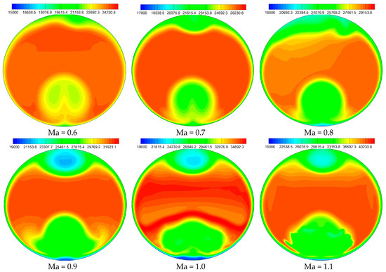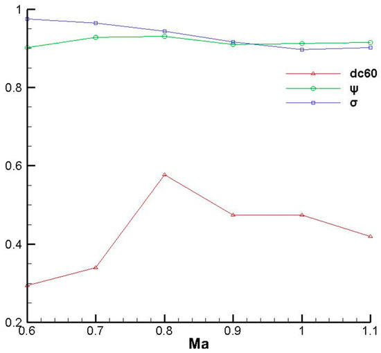 The flow field of model C was calculated at different Mach numbers of 0.6–1.1, with intervals of 0.1. The static pressure of the outlet was changed to 20,000 Pa, while the other boundary conditions remained unchanged. Figure 18 shows the total pressure distributions of the outlet at six conditions. At each condition, two low-pressure zones appeared at the top and bottom of the outlet, respectively, and the areas of low-pressure zones increase with the increase of the Mach number, which conforms to the theoretical expectation. Three aerodynamic parameters at six off-design conditions are shown in Figure 19, including DC60, flow coefficient (ψ), and TPR coefficient (σ). The flow coefficient refers to the ratio of the actual flow to the ideal design flow. The DC60 increases firstly and then decreases with the increase of the Mach number, which is greater than 0.4 when the Mach number exceeds 0.7. Besides, the TPR coefficient decreases with the increase of the Mach number. Nevertheless, the flow coefficient and TPR coefficient are always greater than 0.9 at all six conditions. In summary, the intake is applicable for conditions with Mach numbers from 0.6 to 1.1.