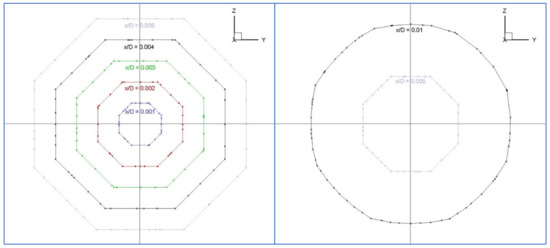 The section x/D = 0.01 is not an octagon, but a polygon with much more elements forming the surface mesh. The number of elements increases rapidly; the cross sections evolve more uniformly when advancing from x/D = 0.01 to x/D = 0.05.