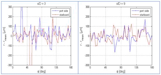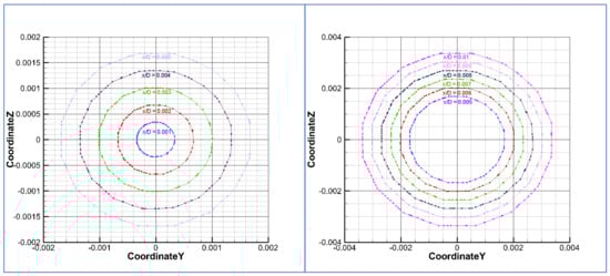 Figure 4 (left)) reveals that the approximation to an ideal circle is better, but it is also evident that the surface grid is irregular and not symmetric. The cross sections for x/D = 0.001 to x/D = 0.005 are represented in