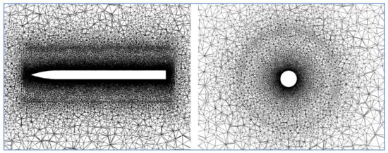 m = 8. When advancing in a longitudinal direction a cross section will be formed by polygons of many elements, which are closer to the ideal circular shape of the body. While every section was formed by 240 elements for the structured mesh, regardless of the radius of the circular section, for these unstructured meshes, the polygons are resolved by a different number of elements and their distribution is irregular. This results in non-axisymmetric meshes, with cross sections, which are different in number and distribution of the elements. To give insight of the implications of this type of meshing, a detail of the tip region for several unstructured grids is shown in